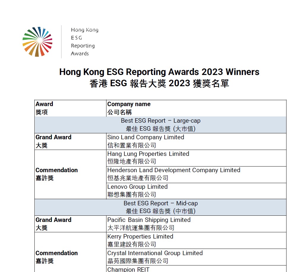 香港ESG报告大奖 (HERA) 于2018年首次举办,是一项非盈利性质的活动,借以建立持份者之间的信任。 HERA由独立评审团组成,评委来自不同专业范畴。这奖项是可持续发展方面中最具声望的奖项之一,目的为表扬任何在香港可持续发展或ESG报告上有杰出表现的上市和非上市公司。